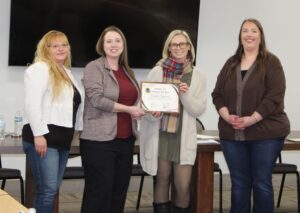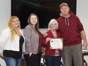 AEOA Volunteer Services and Food Access Manager, Carrie Pellinen (left center) hands Lifetime Achievement Award winner Mary Mollard a plaque during the 2025 volunteer hall of fame award ceremony in Virginia on Friday, Dec. 19. Also pictured are Heather Hanson (left) and Nicole Mellesmoen.